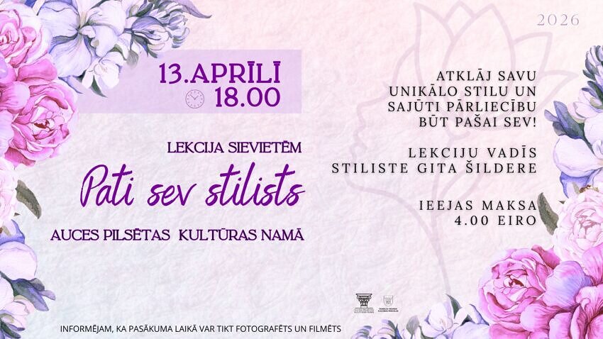 13. aprīlī pl. 18.00 aicinām uz iedvesmojošu lekciju sievietēm “Pati sev stilists!” Auces pilsētas Kultūras namā!