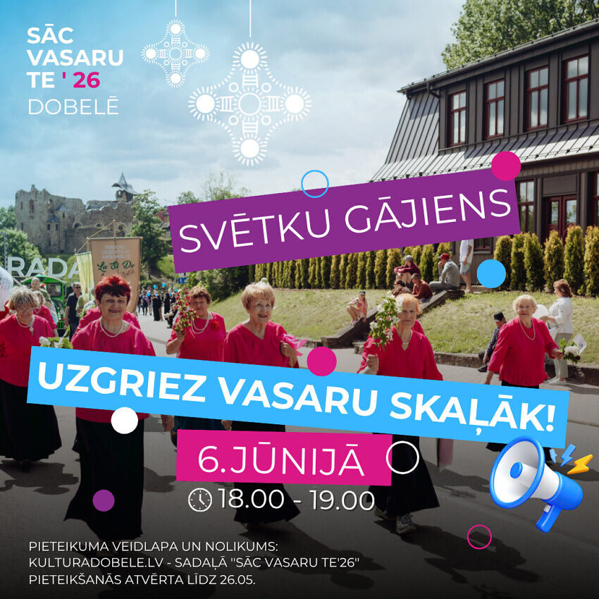 Aicinām ikvienu, kuri DOBELI sauc par savu – amatiermākslas kolektīvus, sportistus, izglītības un kultūras iestādes, novada uzņēmējus, sabiedriskās organizācijas, māksliniekus, mūziķus un citus apvienoties grandiozā svētku gājienā “UZGRIEZ VASARU SKAĻĀK!”