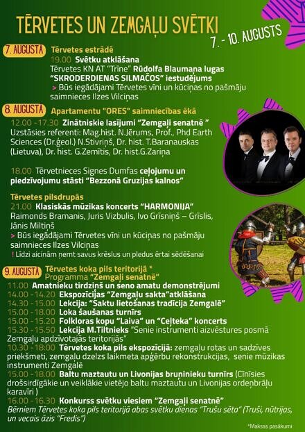 Laikā no 7. līdz 10. augustam Tērvetes vēsturiskajā centrā norisināsies Tērvetes un Zemgaļu svētki, kuros ikvienam interesentam tiek piedāvāta iespēja baudīt gan kultūras programmu “Tērvete – Zemgales sirds”, gan XXII Zemgaļu svētku vēsturisko programmu “Zemgaļi senatnē”.